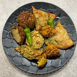Freshly baked filo pastry pie, rolls, triangles and salads (cold food)